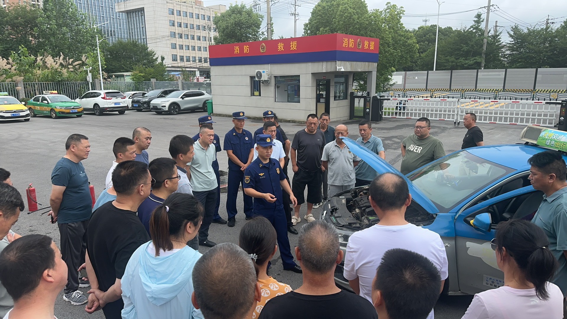 咸安区太乙大道政府专职消防救援站消防员现场讲解了消防器械的使用方法,以及出租车发生自燃时如何扑灭初期火灾,并详细阐述了灭火器的使用技巧与相关常识。