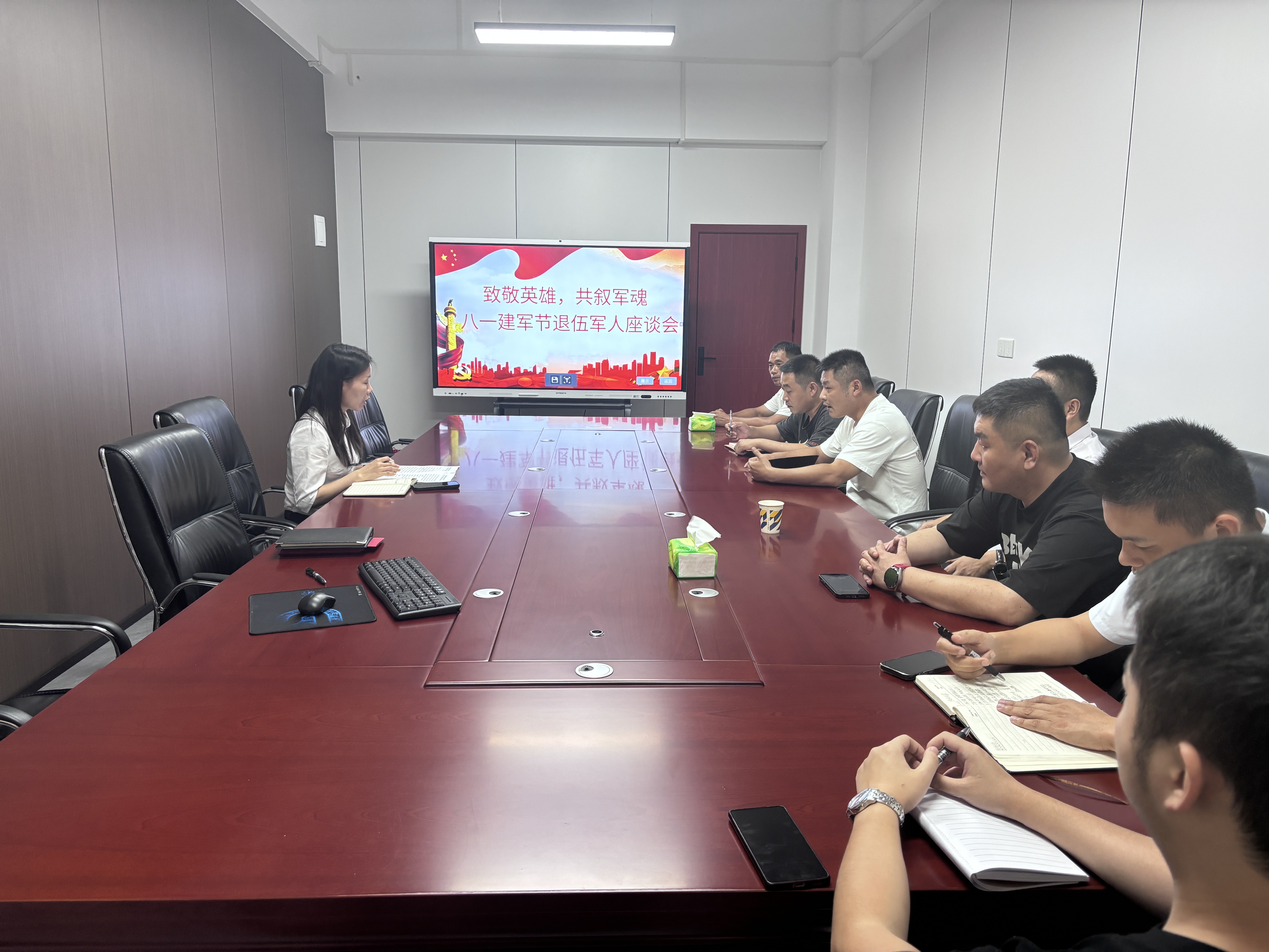 首先,召开座谈会,公司综合办负责人致辞,致辞既真挚表达了对退伍军人为国家和社会所做贡献的由衷感谢,也深切传递了公司对他们的关怀与敬意。随后,现场播放了抗日战争纪录片片段,一幕幕珍贵的历史影像缓缓流淌,带领在场众人共同回溯那段浴血奋战的峥嵘岁月。通过观看影像,大家更直观地感悟到和平的来之不易,也对军人的使命与担当有了更为深刻地理解。