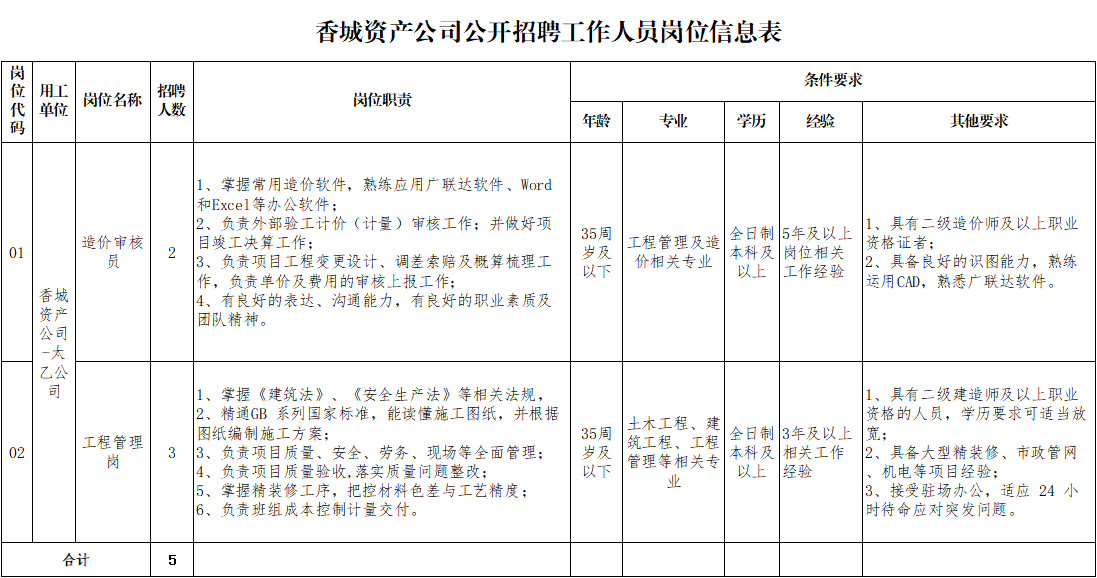 根据工作需要,香城资产公司面向社会公开招聘5名工程专业人员,现将有关情况公告如下: