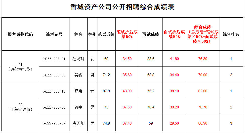附件:香城资产公司公开招聘工程专业人才进入体检、考核人员综合成绩表