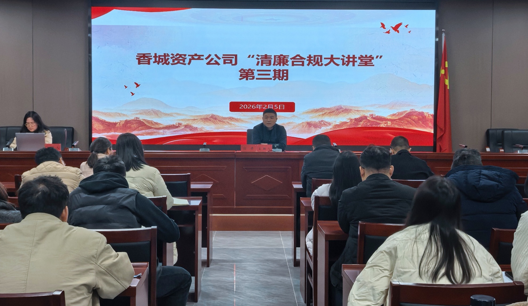 2026年2月5日,香城资产公司举办2026年“清廉合规大讲堂”第三期培训会议。会议由公司党委委员、纪委书记徐卓主持、投融资发展部部长陈思诗主讲,以“从银行视角看企业融资——信贷逻辑与策划实务”为核心主题。公司各部室全体成员及子公司中层干部参会。