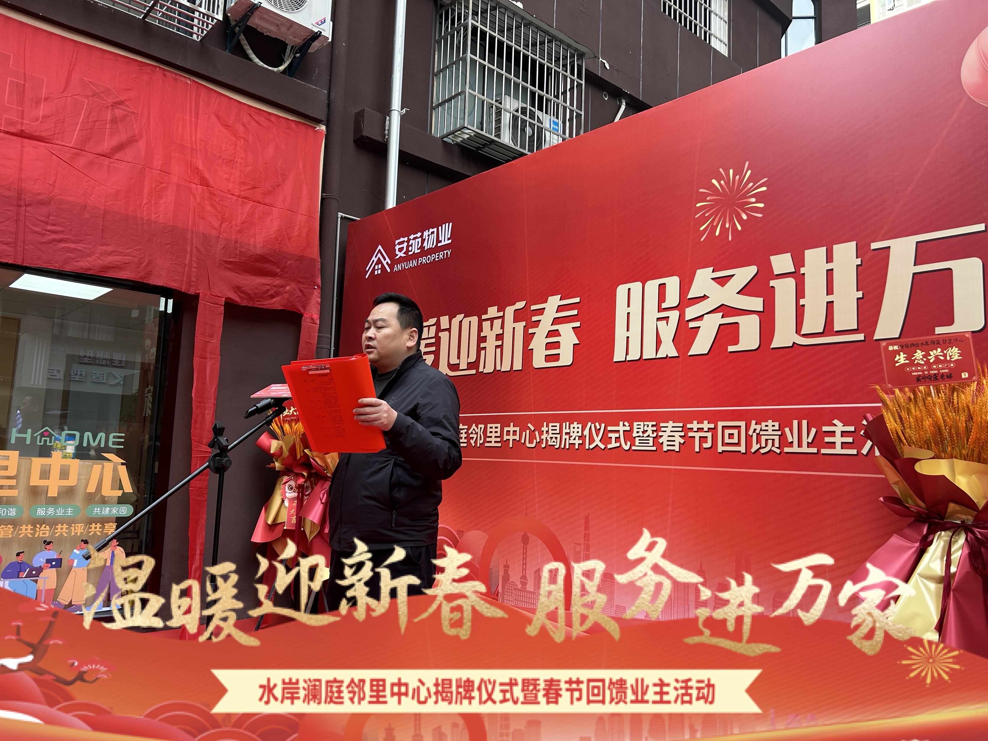 2月11日,正值小年佳节,水岸澜庭邻里中心揭牌仪式隆重举行。温泉街道办、湖北香城资产运营有限公司、咸宁安苑物业公司相关领导与小区业主代表共同出席,见证了这一便民惠民的重要时刻。邻里中心的落成,不仅为小区增添了新春喜庆氛围,更标志着水岸澜庭社区服务体系的全新升级,是温泉街道推动资源下沉、安苑物业践行国企服务担当的重要实践。