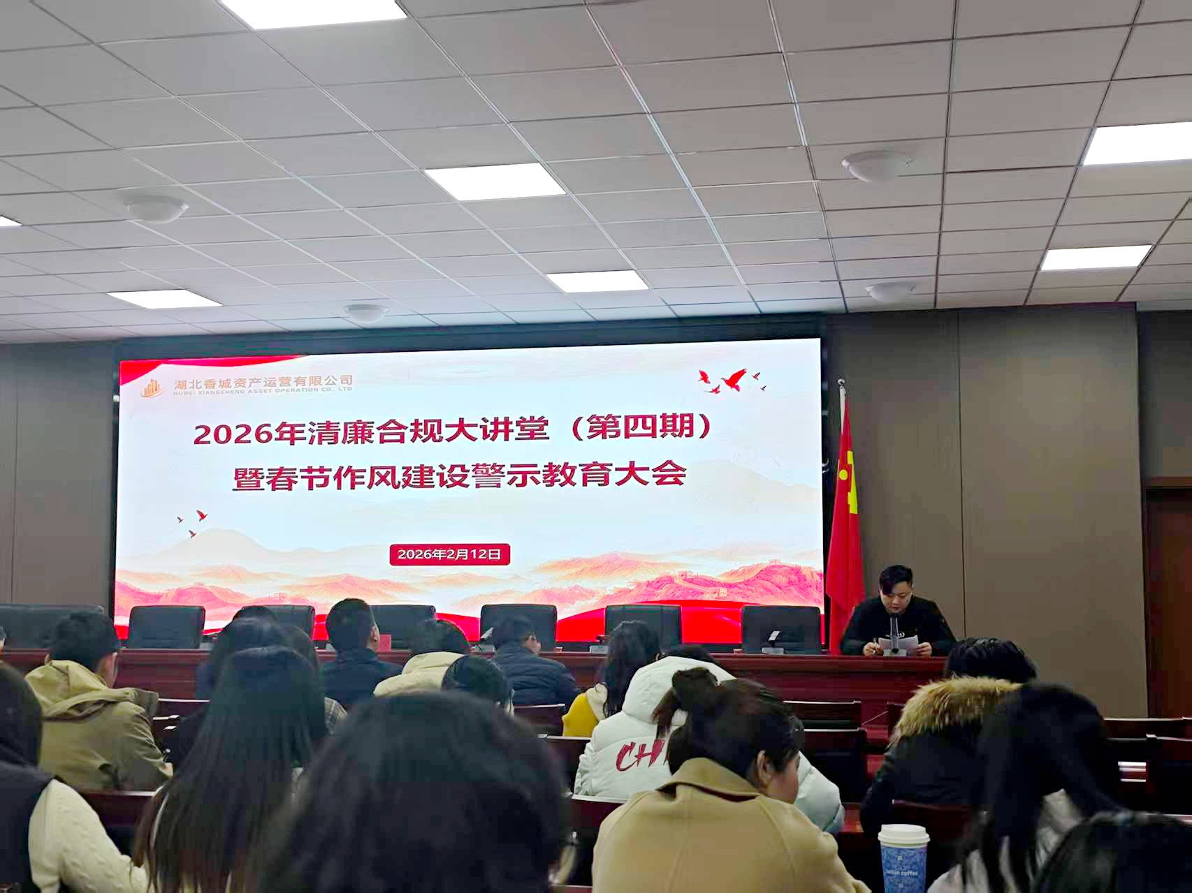为深入推进清廉合规文化建设,切实防范重点领域廉洁风险,筑牢全体职工廉洁从业思想防线,同时抓实春节期间作风建设,严防节日“四风”问题,2026年2月12日,湖北香城资产运营有限公司召开2026年清廉合规大讲堂(第四期)暨春节作风建设警示教育大会。公司全体班子成员、各部室全体职工及子公司中层及以上人员参会。